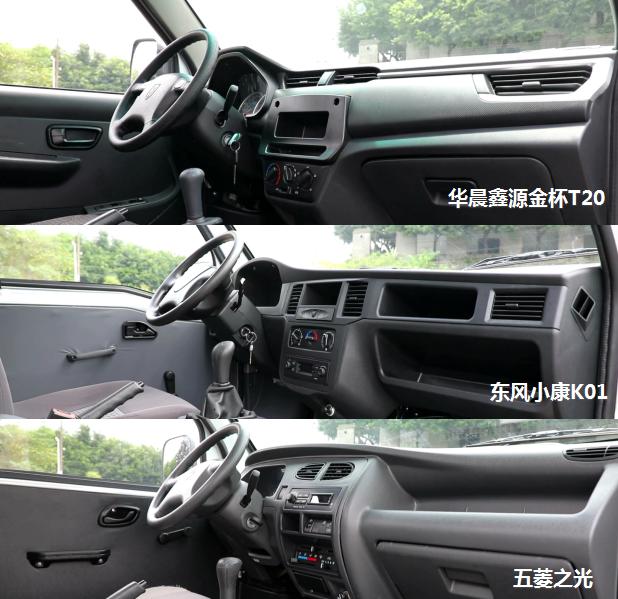 车厢方面,华晨鑫源金杯T20与东风小康K01的车厢尺寸基本一致,均为2700*1440*370mm,五菱之光小卡2501*1420*362mm的车厢尺寸则相对略小了一些。